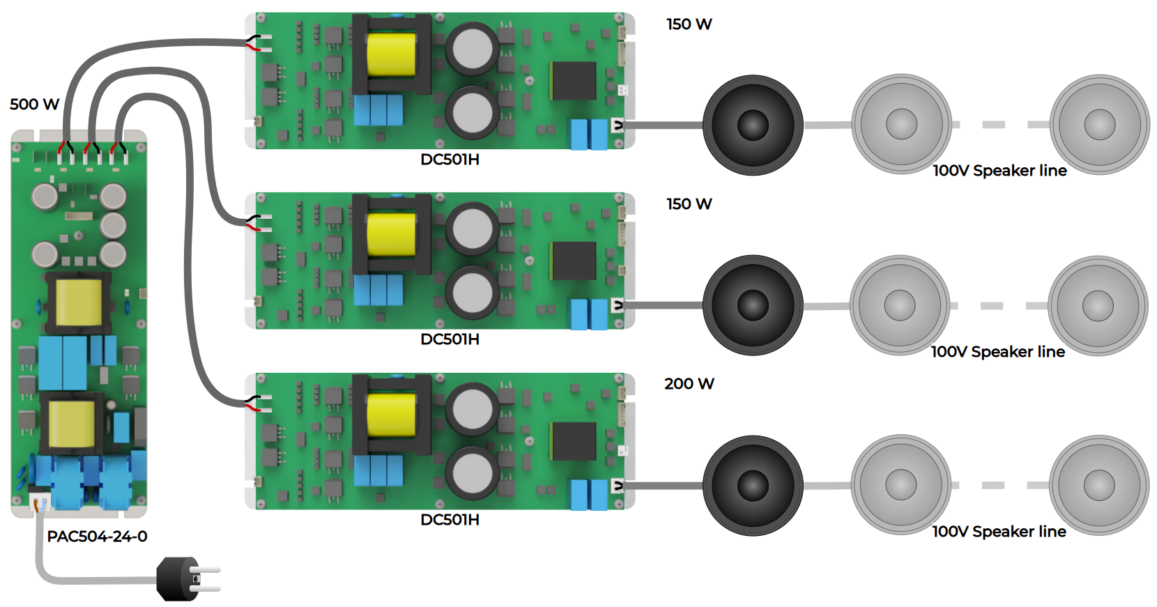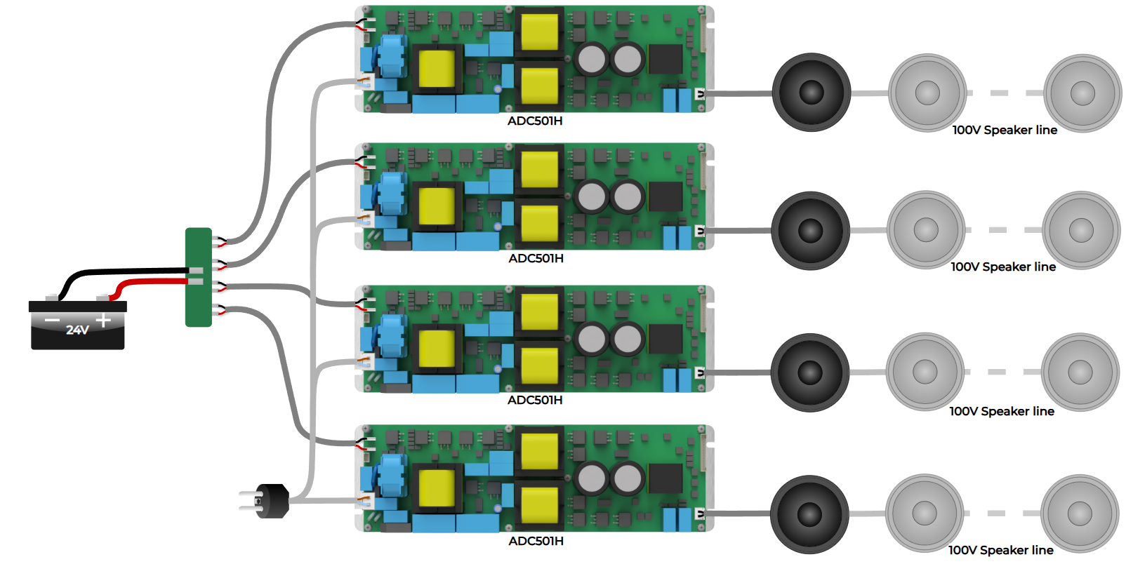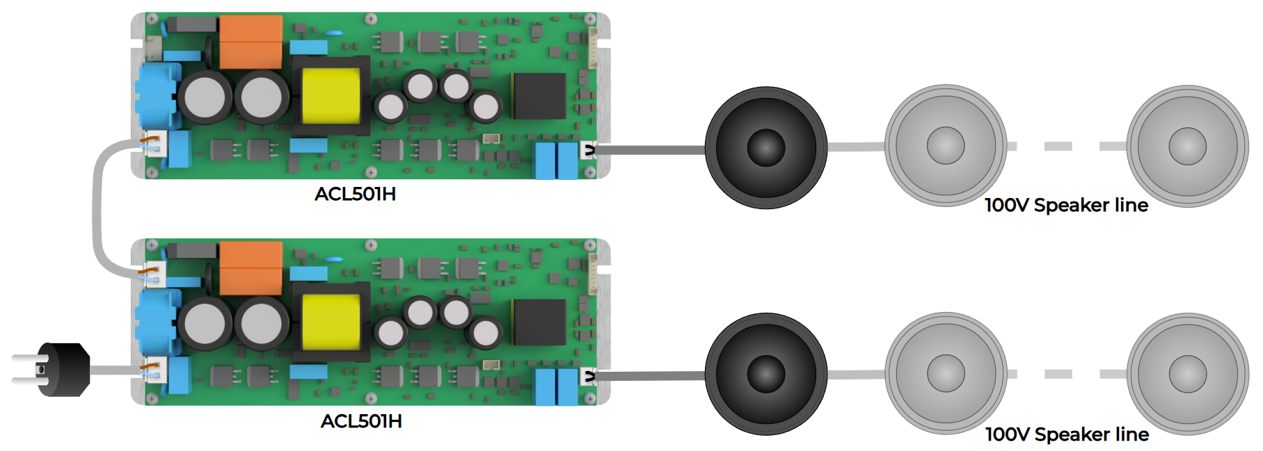 Our ACL501H modules are designed for direct AC operation. Up to four units can be combined within a single AC-powered system, efficiently driving multiple loudspeakers or distributing power across several 100V speaker lines.