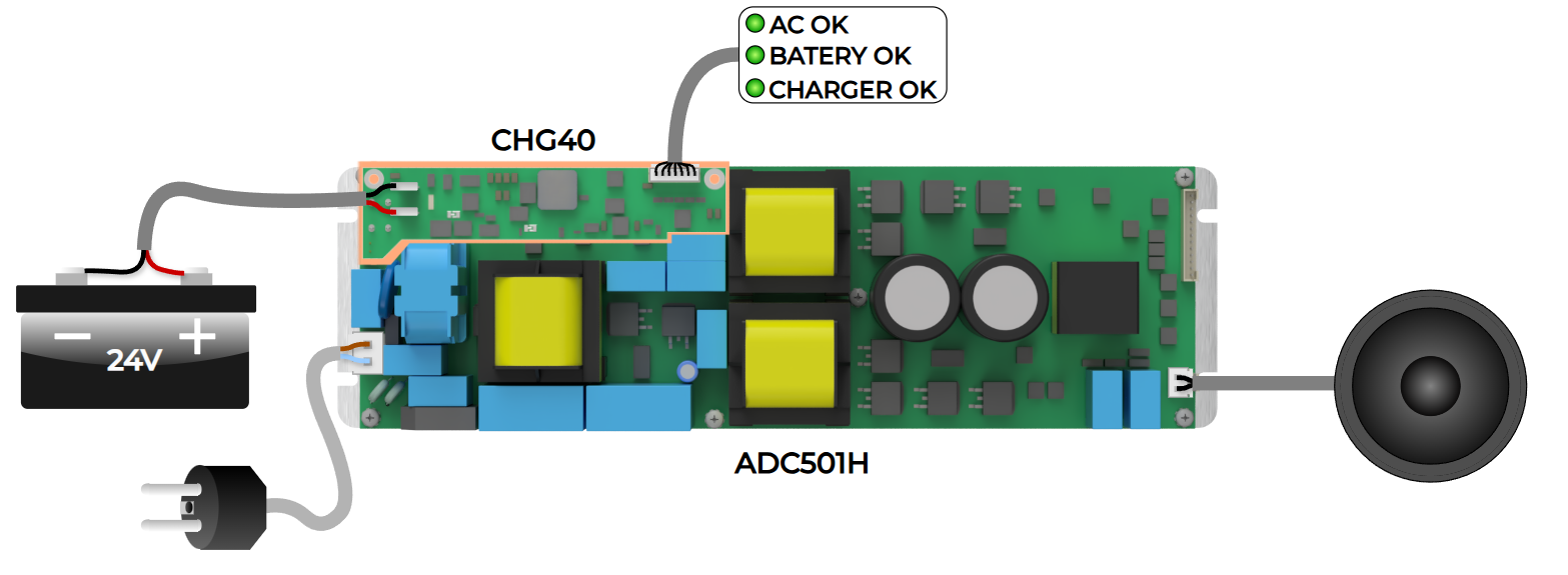 With the CHG40 mezzanine board, the ADC501H operates as an AC-powered amplifier with automatic DC backup switching. It also integrates battery charging functionality, making it fully suited for EN54-4 and EN54-16 compliant applications.