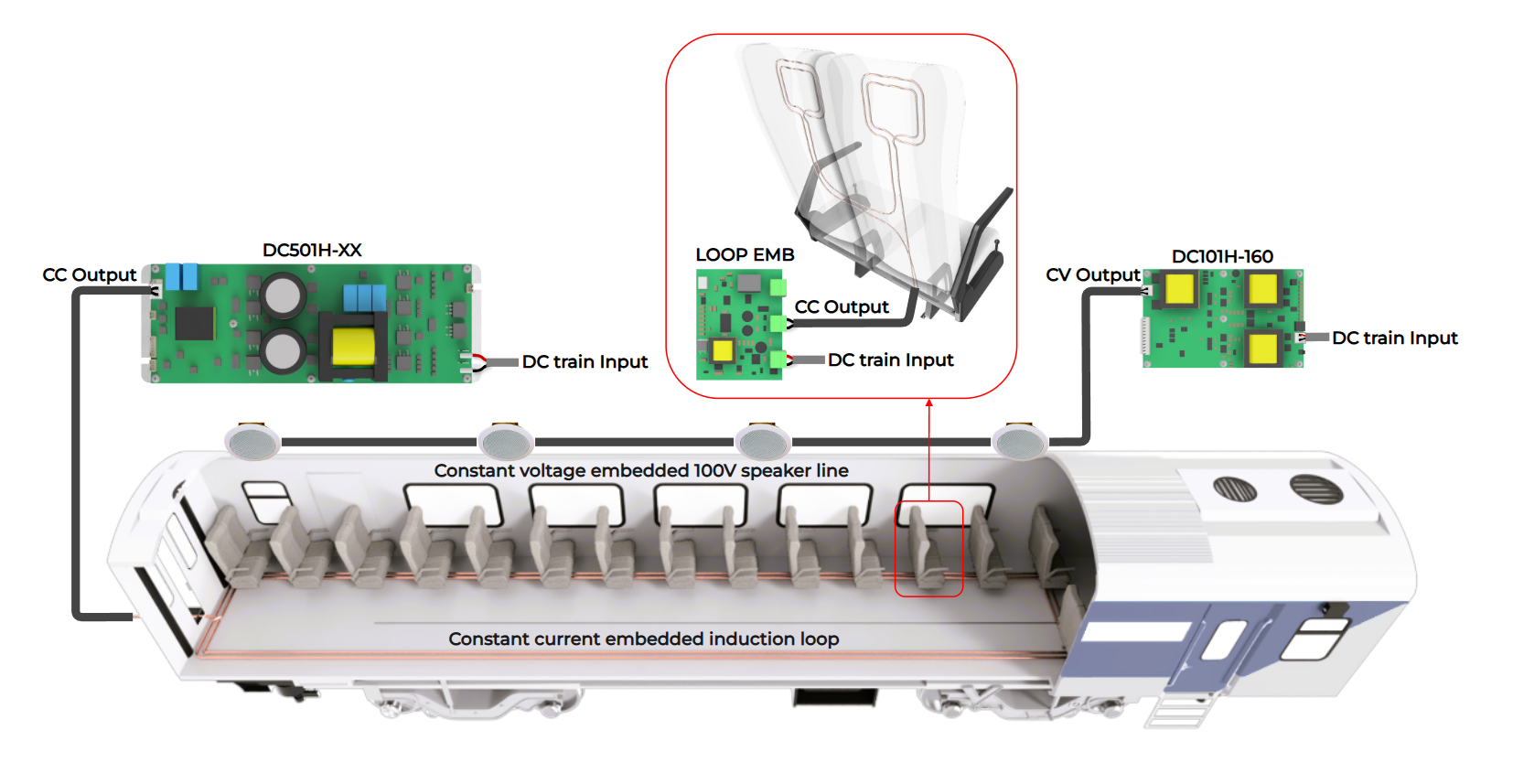 Our LOOP EMB and DC501H AFILS amplifiers (see ODM) are custom-designed with wide DC input capabilities: an ultra-wide 12V to 160V range for the LOOP EMB, and dedicated 24V, 48V, 72V, and 110V versions for the 20Arms DC501H. They can drive hearing induction loops across the entire length of the vehicle or provide targeted coverage for specific passenger areas.