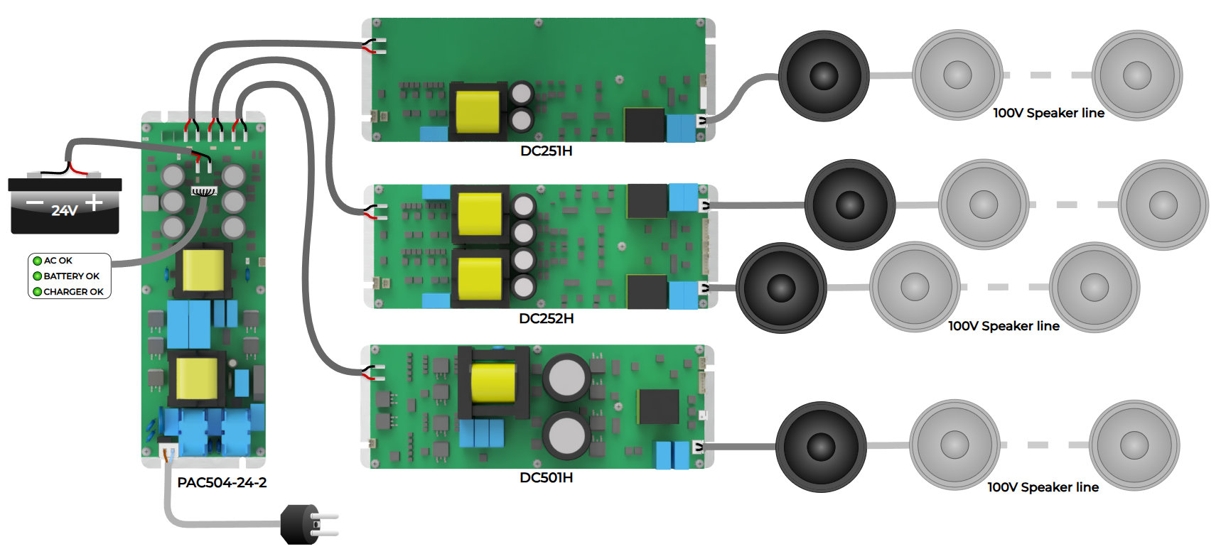 Public address: POWER SHARING WITH DC POWERED AMPLIFIER VIA PAC504-24-0 AC/DC POWER SUPPLY