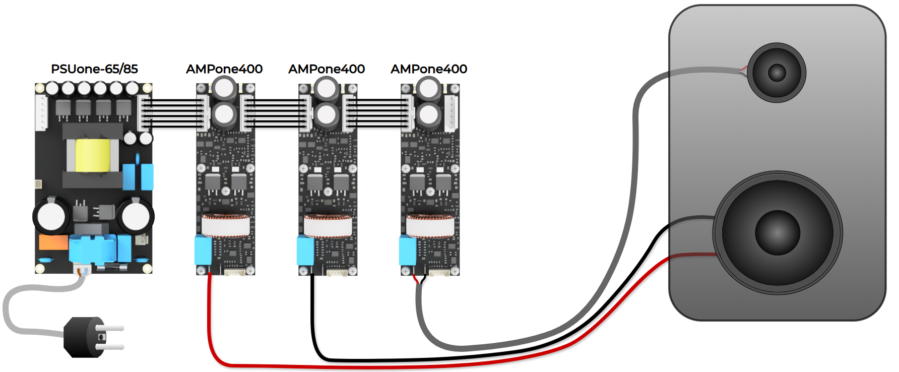 With our PSUone-65 (or PSUone-85power supply, the AMPone400 modules can be combined, in normal and bridged mode to create a compact, high-performance audio system.